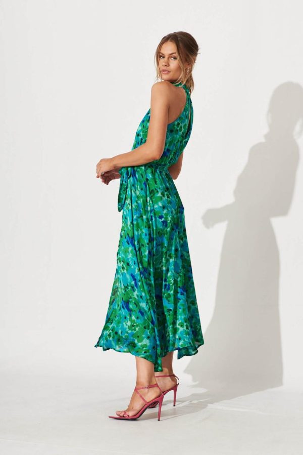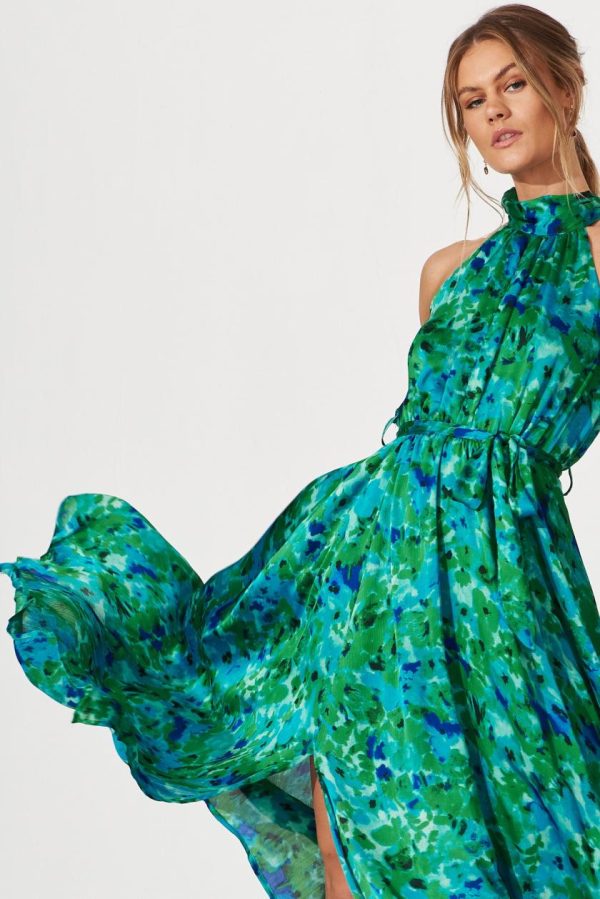 Women Kiss Me Halter Neck Maxi Dress In Green Watercolour Print | St Frock Cocktail
